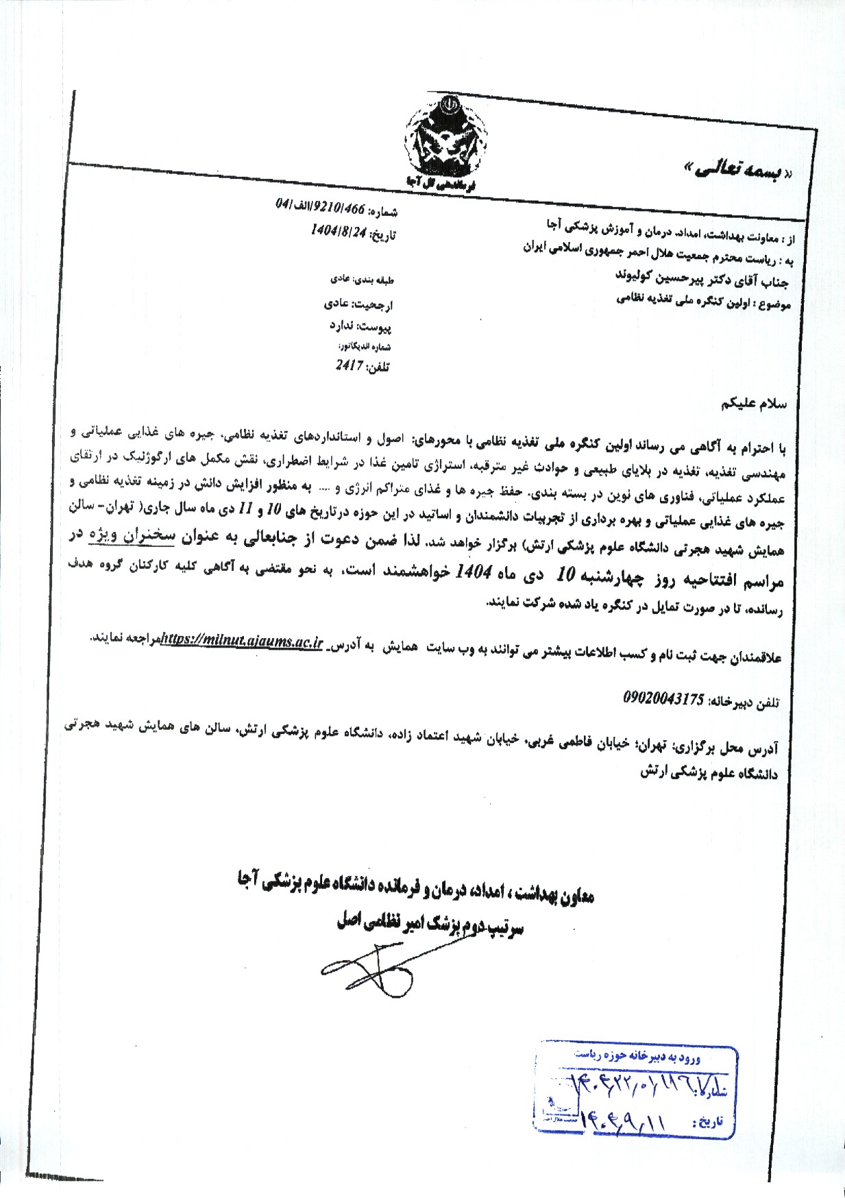 دعوت به اولین کنگره ملی تغذیه نظامی مورخ 1404/10/10